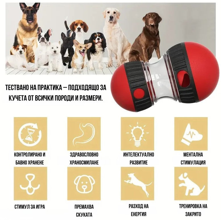 FeedBall е интерактивна топка за бавно хранене, създадена да държи кучето фокусирано, активно и спокойно. Пълниш я с гранули или лакомства, топката се търкаля, а храната излиза постепенно. Това превръща всяко хранене в игра, стимулира ума и намалява скуката у дома. Подходяща е за всички породи и размери, изработена е от безопасни и лесни за почистване материали, и издържа на ежедневно използване. FeedBall ангажира кучето по естествен начин и му дава активност дори когато не си вкъщи.